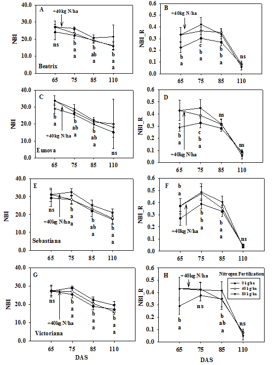 Figure-3 Nitrogen Balance Indices on four evaluation dates (DAS 65, 75, 85 and 110) recorded via Dualex® (NBI) and Multiplex® (NBI_R) of the barley cultivars Beatrix (A, B), Eunova, (C, D), Sebastiana (E, F) and Victoriana (G, H) fertilized with different nitrogen levels (0 kg/ha = closed circle; 40 kg/ha = open circle; 80 kg/ha = closed triangle). Means ± SE (n = 8 repetitions) followed by different letters indicate significant differences between treatments, ns indicates no significance (t-test and ANOVA, p ≤ 0.05) by Duncan Test.