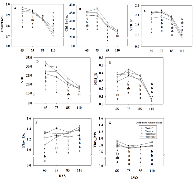Figure-5. Chlorophyll, nitrogen and flavonol indices on four evaluation dates (DAS 65, 75, 85 and 110) recorded via MiniVeg-N (A = F730/F690), Dualex® (B = Chl Index, D = NBI and F= Flav_Dx) and Multiplex® (C= SFR_R and E = NBI_R) of the barley cultivars Beatrix = close circle, Eunova = open circle, Sebastiana = close triangle, and Victoriana = open triangle. Means ± SE (n = 8 repetitions) followed by different letters indicate significant differences between treatments, ns indicates no significance (ANOVA, p ≤ 0.05) by Duncan Test.