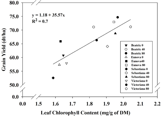 In this study, the effect of different nitrogen fertilization levels was reflected in leaf chlorophyll content and in grain yield values, as dosage increments were responsible for higher chlorophyll content and productivity. This response of crop production to N supply is in accordance with other studies, furthermore proving the importance of the nutrient as a major constituent of the chlorophyll molecule, whose supply can trigger an accumulation of the photosynthetic pigment in plants, thereby influencing final yield [33-36] .
