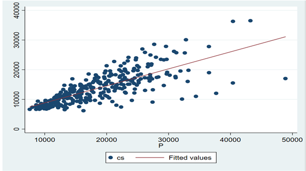 There is a positive correlation between per capita GDP and per capita consumption expenditure of urban residents. For every percentage point increase in the per capita GDP of urban residents, the per capita consumption expenditure will increase by 0.2272 percentage points (significant at 1%). This shows that the increase of per capita GDP improves the level of national economy, the income of residents, the consumption ability of residents, and the consumption level.