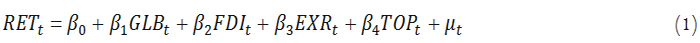 The existence of cointegration among stock market returns (RET), globalization (GLB), foreign direct investments (FDI), exchange rate (EXR) and trade openness (TOP) confirms there ought to be at least one existence of causal relationship. The idea of causal relationship emanates from the notion that globalization could motivate stock market returns. The results obtained from the Granger causality test is presented in Table 7: