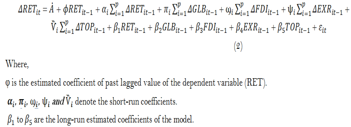 This study adopted the pooled mean group (PMG) approach to autoregressive distributed lag (ARDL) method of estimations suitable for panel data analysis. The PMG estimator was proposed by Pesaran, Shin, and Smith (1999) when pooling and averaging of coefficients over the cross-sectional units. The PMG-ARDL mechanism was used because it accommodates variables with mix level of stationarity of variables such as I(0) and I(1), but not I(2) like this study. Also, the PMG-ARDL approach captures the short-run and the long-run dynamics of the model. Therefore, the PMG estimation was applied in this study. The PMG-ARDL form of Equation 1 is written as displayed in Equation 2 below: