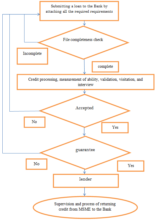 The figure above illustrates that the legal procedures undertaken by MSMEs notwithstanding applying for bank credit, MSMEs must submit applications in writing, complete with all existing requirements such as clear financial statements, business licenses, principal numbers of taxpayers, and so on. File inspection continues. If the file is declared complete then enter the next procedure, but if it is incomplete then return it to the MSMEs applicant. The process is continued with credit processing, starting with file validation by a notary who has been appointed by the bank, measuring the ability of MSMEs to repay loans, visiting the MSMEs location, interviewing the MSMEs chairman. If all of these stages are able to convince the bank, then proceed to the next step, which is approval. If it has been approved, consideration is given to the credit guarantee agency (Insurance), if the insurance agrees, then proceed with the signing of the credit agreement in front of the notary. The next step is disbursement or lending. Finally, observation, and supervision, as well as the process of returning credit from MSMEs to the Bank.