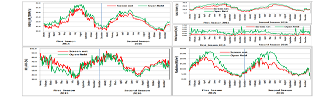 The results of microclimatic conditions during this study are shown in Figure 1 including mean air temperatures, soil temperatures, wind speed, relative humidity and net radiation under screen net during the two seasons from January 2015 to December 2016. Mean air temperature and wind speed were reduced under screen net, during daily summer hot hours, meanwhile relative humidity has been increased compared to open field. Consequently, radiation was reduced under the screen net, which indicates that the soil received a fairly low amount of solar radiation as compared to the open field. Figure 1 also shows that 2015 was hotter and drier than the other one of 2016. These results were in line with those reported by Perez et al. (2006); Elad et al. (2007); Retamales et al. (2008) and Stamps (2008) who studied the influence of screen net upon temperatures, radiation and other microclimate parameters under different net cover and showed that the air temperature and light intensity decreased, while relative humidity increased under screen net.