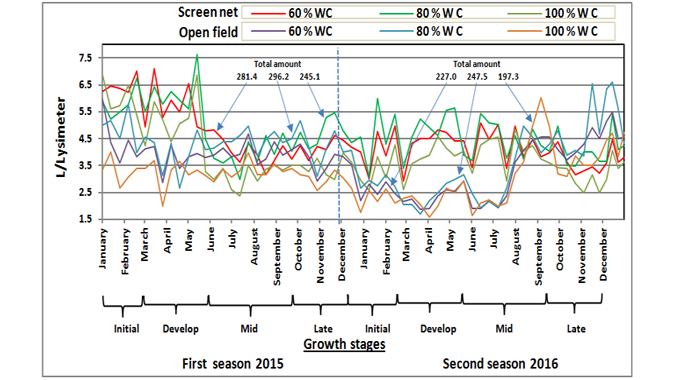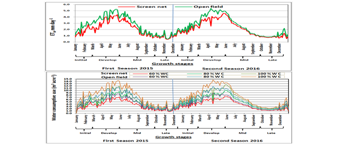 The daily climatic data were used for estimating the daily reference evapotranspiration (ETo) according to the "modified Penman" equation from January 2015 to December 2016. The data in Figure 2 presents the daily reference evapotranspiration (ETo) during the two seasons. The total reference evapotranspiration (ETo) values in the two seasons for the screen net and open field treatments were 423.7 and 524.5 mm, respectively. The highest values were obtained on May 21, 2015 and April 11, 2016 at 5.3 and 5.4 mm day-1 from the open field treatments. Meanwhile, the lowest values were 0.42 and 0.52 mm day-1 under screen net treatments in November 11, 2015 and December 27, 2016 respectively. The values were gradually increased with the progress in plant development during hot dry summer season. It is important to note that a high relative humidity, despite the reduction of radiation (photosynthetically active radiation), combined to lower temperature inside the nets which could decrease the atmospheric vapor pressure deficit and therefore the evapotranspiration crop demand decreased (Allen et al., 2006). Also, the decrease in evaporation associated with the use of nets and a significant reduction in wind speed (Elad et al., 2007).