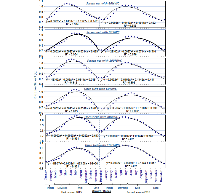 Determination of crop coefficient (Kc) value depends on planting time, stage of crop development, climatic conditions and soil moisture which is usually expressed as a function of time (days after planting). In the present investigation, the values of Kc were calculated by using actual evapotranspiration (ETc) which was measured by volumetric method (lysimeter container) under the various rate of water consumption with and without screen net that is nominated as a function of days after planting (Figure 3). The values of Kc increased gradually and reached the maximum at the development stage for the screen net. Meanwhile, this maximum was shifted 16 days later for the open field, and then both decreased gradually till the end of the growing season. Harvesting begin 35 and 25 days earlier in screen net treatment than in open field in both seasons, respectively. The screen net treatments and the Kc values were the maximum with the optimum amounts of irrigation water with the rate of 80% water needed, followed by the 60% under screen net then the open field treatment. The mid-season value is higher than initial and ending values opposite the trend of (FAO 56) as a result of under arid and semiarid regions, the trend was smooth and normal, which may be due to the effects of stomatal opening during periods of peak ET. Adverse for humid and subhumid climates where there is less stomatal control by citrus, values for Kc ini, Kc mid, and Kc end can be increased by 0.1 - 0.2 following Rogers et al. (1983). The values are in correspondance to Doorenbos and Pruitt (1977) and with more recent measurements. Moreover, data in the same figure represents the six order polynomial regression equations and the coefficient of determination (R2) which describes the relation between the values of Kc and the days after planting. These relations exhibit highly significant correlations with the addition of different levels of irrigation. Alternatively, Kc for navel orange exposed to different levels of irrigation water with and without shading can be directly estimated from those mathematical models.