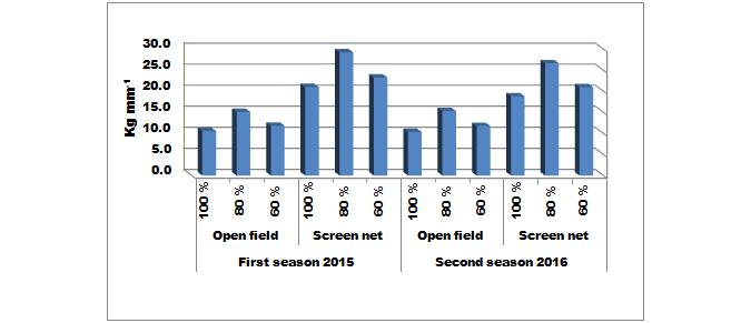 Among the different treatments the highest BCA in the second season was recorded 3.6 in screen net with 80% irrigation level; meanwhile, the lowest BCA in the first season was recorded 2.4 in open field with 100% irrigation level (Table 6).