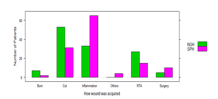 Figure-1. Comparison of cause of wounds of patients attending the SPH and NGH facilities.
