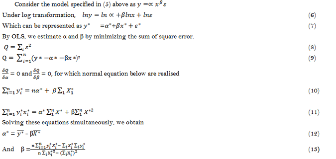 This gave rise to the non-linear model which can be made intrinsically linear using the log-log transformation. Following the log-log transformation, there was a form regression model which can be estimated using the ordinary least square (OLS).
