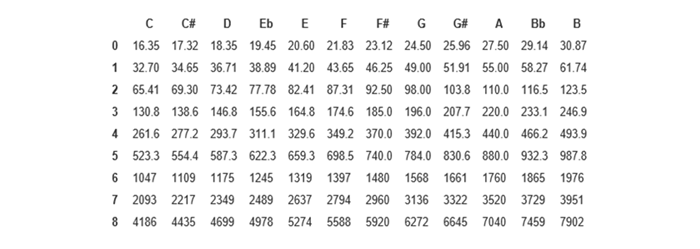 The notes appear in a cyclic pattern. That means after C, C#, D up to A, A#, B it will again have C but this time frequency of C will be double of the previous frequency of C. There are many other notes that has frequency which is a power of 2s multiple like 4, 8, 16 of a specific note [2 ]. Each of these notes belongs to a different octave. So, an octave is consisted of notes in between a frequency and its double or half frequency. A note appearing in a musical chord might belong to multiple octaves simultaneously. The two consecutive notes in the note cycle is termed as Semi Tone apart. That means note C and note C# are a semi tone apart. Two semi tones create a Tone [2