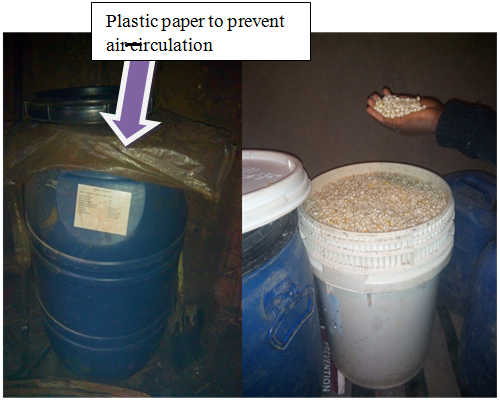 Also, farmers integrate rubber, metal drums, and plastic containers with insecticidal plants leaves to preserved and stored their grains expecially corn, beans and soybeans. This is done by mixing the grains with the fresh insecticidal leaves and puting them in the drums or grinding the dry leaves and mixing with the grains before puting them in an air-tight versels. In situations where the lids of the drums are not tight-fitting, plastic papers are placed on the lid before covering the drums or bucket Figure 2 in order to prevent the circulation of air. This integration method is very effective, easily available, durable and reduces rampant waste disposals. This because the drums and plastic containers that were initially used for different purposes like transportation of palm oil, fetching of water are disinfected and reused as storage facilities instead of disposing them in the open environment. This is similar to Notsi [14] observations in the villages of Tsitas Nek (Lesotho) and Mabeskraal Village in South Africa where indigenous vegetables are cooked, sun dried thoroughly and stored in plastic bags or in some air-tight containers. In the similar lane, Ponge [15