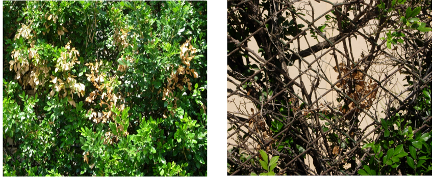 Figure 2. Murraya paniculata plants with symptoms of Lasiodiplodia pseudotheobromae. Left, blighted branches, right advanced wound. |