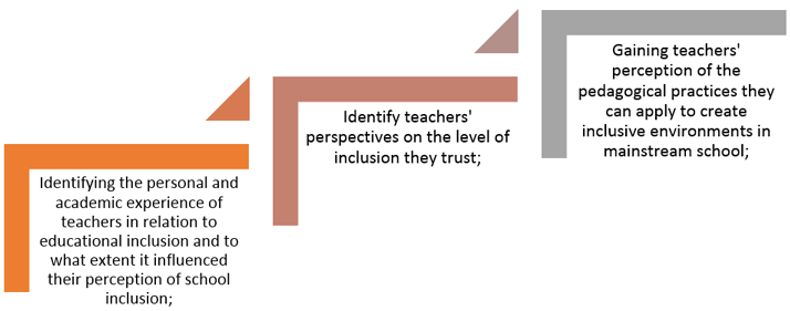 The objectives of this research focus on the following ideas as presented in Figure 1. The focus is on the identification of teachers personal and academic experiences regarding inclusion, going on through their level of readiness to teach in an inclusive setting and then reaching their perception regarding good practices in order to create an inclusive school environment.