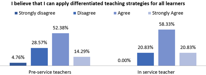 Figure 2 illustrates the belives of teachers regarding their skills in terms of usings learning strategies that are relevant and usefull for all learners. As presented in the figure above, both categories of primary education teachers that are in different professional stages, are either to a great extend or in total agreement that they can teach consistently differentiated. The percentage of student teachers who are concerned about their ability to apply differentiated teaching is 33.33% (total disagreement) compared to the other population of teachers where only 20.83% are concerned about their ability to apply differentiated teaching strategies for all learners.