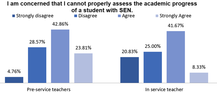 Figure 4 evaluates the extend that teachers feel confident in terms of their assemesnt skills when it comes to SEN children. Proper assessment of school progress is a topic for which respondents have some concerns. Mainly 42.85% of preservice teachers largely agree that they are concerned about the issue and also 41.66% of in-service teachers, who have had initial training, share a similar concern regarding their ability to properly asses the academic process of a student with SEN. A big difference is seen in in-service teachers’ readiness versus pre-service teacher readiness in term of their ability to handle the assessment process properly.