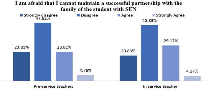 While personal trust in maintaining a positive relationship with the student's family in school is often shaped by professional experience in Figure 5 it is presented teachers concerns regarding their ability to maintain a successful partnership with the SEN children` families. As for 71.42% of pre service teachers agree that partnering with the family is not a cause for concern. The variation in responses is similar for both samples, being fairly few respondents in each sample who feels unsecure with the ability to maintain a successful partnership. Almost half of the population of each sample (47.62% of the pre- service teachers and 45.83% of the in-service teachers), indicate that they feel confident in establishing trusting partnerships. That is why it is important that teachers and school board members to feel responsible for ensuring that children's development and education are supported in the best possible way. Inclusive schools must value and integrate each student's uniqueness as a participant in the educational process. More than that, parents must support school activities, recognize the relevance of education in the training and development of children, and recognize the importance of activities that contribute to the development of skills and pupils' goals for success.