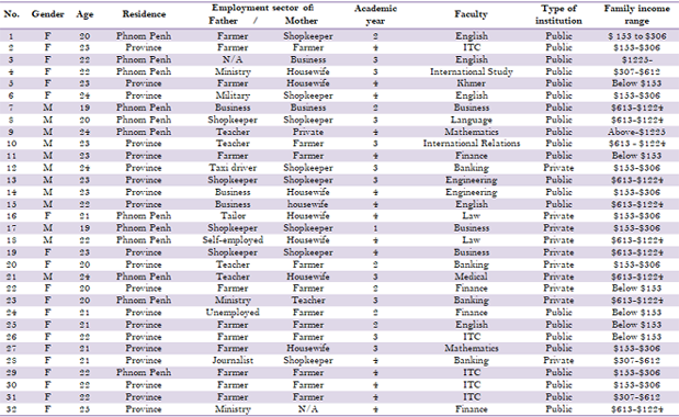 In Table 4.1, the respondents’ details were divided in 9 categories; Gender=52 (20 female and 12 male), Age from 19-24 (median age=21.9), residence (12 from Phnom Penh and 20 from Province/rural), occupation of father (11 farmers, 4 teachers, 3 business, 3 ministry, 4 shopkeers, and 1 each for taxi driver, self-employed journalist and military), mother’s occupation (11 farmers, 8 housewives, 8 shopkeepers, 2 in business, 1 in private, 1 teacher), academic year from first to fourth year (median academic year=3.2), major (11 students in Finance, Banking and Business, 7 students in ICT and engineering, 2 in law, 1 in Khmer literature, 1 in medical and two in international relations and studies). There were 10 students came from private universities and 22 came from public universities. The income range started from blow $1553 to above $1225.