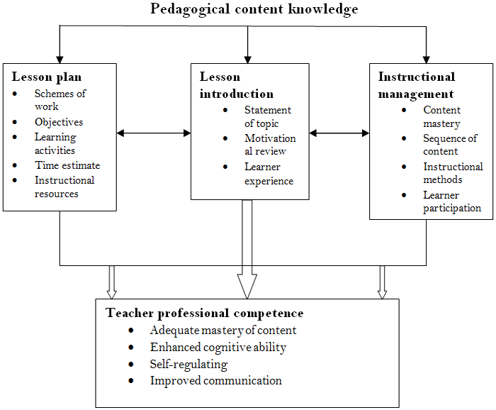 ) teachers with inadequate content knowledge tend to be dull, criticize and scolds learners, provide ineffective evaluation, discipline by violence, and exercise authoritarian leadership which weaken professional growth. Under such circumstances, learners become disinterested in learning process which may lead to indiscipline as well as modelling of inappropriate behaviour. For this reason, teachers require mastery of pedagogical content knowledge for integrating information derived from course work to practical instructional management through effective preparation, lesson introduction and development, sequence of content and utilization of resources for nurturing professional competence.