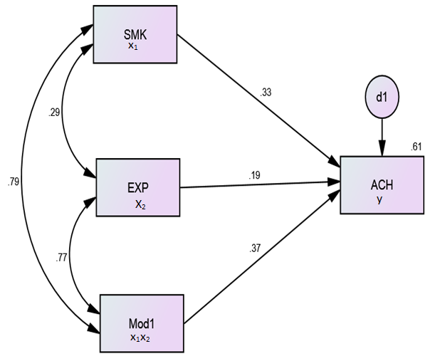 Figure 2 shows the moderating role of teaching experience (EXP) in the relationship between Subject Matter Knowledge (SMK) and Academic Performance (ACH) in elective mathematics. It can be seen that teaching experience moderates the relationship between subject matter knowledge and academic performance. Specifically, it can be seen that the interaction term Mod1(X1X2) plays a significant role since it predicts academic performance higher with a standardised beta score of .37 Equation 1. Table 1 presents the results as shown in Figure 2 in a tabular form.