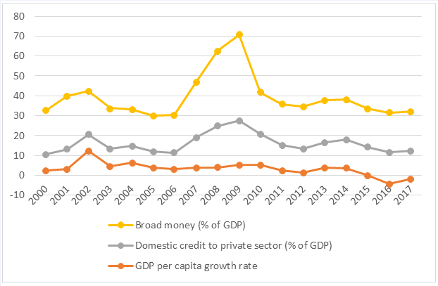Furthermore, Figure 1 depicts the trend of growth rates and financial development indicators (broad money (% of GDP) and domestic credit to private sector (% of GDP)). Statistical evidence shows that between 2000 and 2017, growth rates of GDP per capita, compared to the values of financial sector indicators, are largely poor. Accordingly, the trend indicates worse economic performance in recent years (2015 - 2017) with negative growth rates in spite of relatively higher values of both broad money (% of GDP) and domestic credit to private sector (% of GDP) in the period. This slightly negates the assertion that support the growth effect of finance in the economy (Akingunola, 2013; Ogwumike and Salisu, 2014