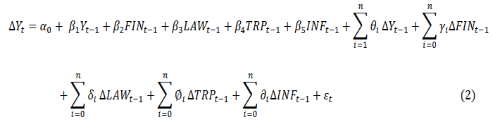 Focusing on the short run estimates, in Table 5, the estimates of the main variables (financial development indicator, law and order and the interaction variables) of interest are similar to the results obtained in Table 4 for long run estimates. These findings depict that, in the short, the same effects also hold, and that the seemingly related policy measures could be effective in both periods. Analogously, for control variables (TRP & INF), the signs of the estimated parameters are retained. While TRP is significant in both models, INF only finds to be significant in model 1.