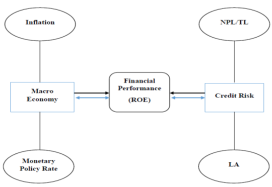 In this conceptual framework, the profit maximization function is represented by financial performance measured by the banks Returns on Equity (ROE) over the study period. On the other hand, the ratio of Non-Performing Loans to Total Loans (NPL/TL) and the ratio of Total Loans to Total Assets (TL/TA) represents the proxy for credit risk exposure. The conceptual framework also presented two other variables. Thus, inflation and central bank’s monetary policy was used as a proxy for macroeconomic indicators. The importance of these two variables is to understand their influence or their causal effect on both the dependent and independent variables. The study seeks to find the degree of responsiveness between credit risk exposure of banks and the macroeconomic economic variables and how it transcends to the performance of the banks.