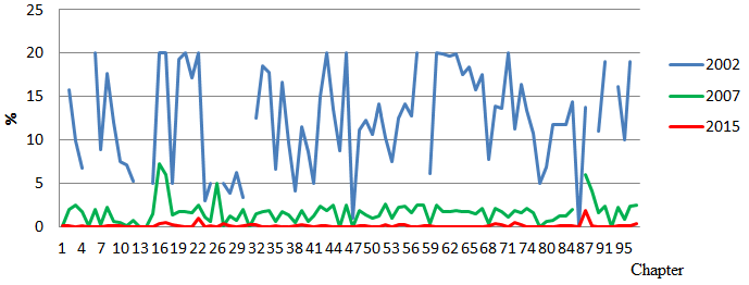 Figures 1-4, respectively, reflect adjustments in tariff rates for Chapters 1-25, 26-50, 51-70, and 71-97. The tariff rates for each chapter are determined by summing up the tariff rates of all goods at the level of 6-digit divided by the total number of products in that Chapter. Between 2002 and 2007, the tariff rates were the same in levels. One interesting point is that the Vietnam tariff rates imposed in 1994 were similar to or lower than the Vietnam tariff levels levied through the chapters in 2002 and 2007. Nevertheless, the tariff rates were considerably lower compared with 2007 to 2015. Chapters 48-67 in particular, the difference between two years in tariff rates is very high. The tariff rates have decreased significantly since joining WTO. This is one of the major determinants helping to increase the value of imports during this period.