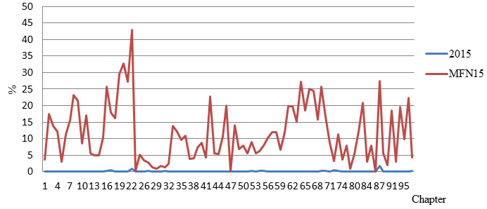 When countries integrate into the global market, the conventional trade barriers are gradually reduced. Vietnam also pursues the process of liberalizing its economy. In addition to joining the WTO in receiving and providing non-discriminatory treatment, Vietnam has joined bilateral FTAs and along with ASEAN signed other multilateral FTAs. Most tariff lines dropped the point under the MFN scheme since entering WTO. Tariff rates for some chapters dropped significantly. The tariff rates that Vietnam provides to FTA members are especially low. Many of the tariff rates in chapters are zero percent. And the tariff rates for certain chapters in the preferential system are lower than those in the MFN scheme.