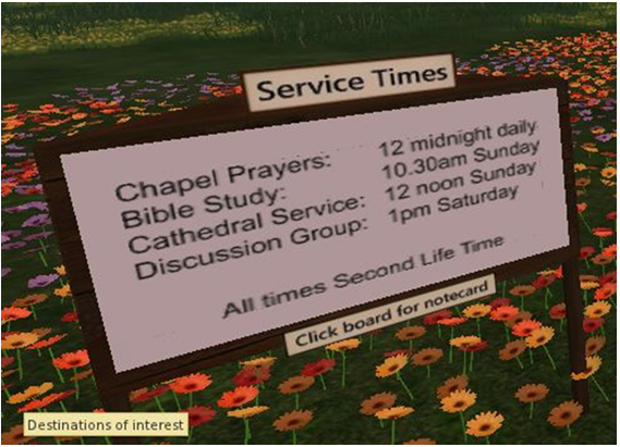 In this context, cultural practices and symbolisms that exist in real life also appear in virtual/potential communities. In Epiphany Island - Home of the Anglican Cathedral in SL there are two regular liturgies, prayers and weekly reading of the Bible. The weekly Bible study is held on a Sunday morning (Second Life Time). It is a regular worship event that is repeated on an annual, calendar basis and is included in the daily worship life of the community. They were held every Sunday in a place called “Enorchestia”, shortly before the Sunday prayer was performed at the community cathedral Figure 2. Attendees, as they enter the community space by touching the Bible Figure 4, which is placed and open on the table, they receive with a notecard the text that they will access and interpret in their weekly meeting.