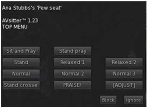 Women, just like the community’s men, believe in praying to communicate with God, expressing their faith and asking for forgiveness or asking for something else. They pray not only anywhere in the digital environment of their community but also in whatever way they wish, either alone or with others (morning prayer in the chapel, Sunday prayer in the Cathedral), praying the official Anglican Church prayers or prayers which each one creates alone. In the Epiphany Island - Home of the Anglican Cathedral in SL, a study of the Bible is carried out every Sunday morning, in the area called “Orchestration”, shortly before Sunday’s prayer. Those present, as they touch the Bible that exists in the digital environment, receive the excerpts that then comment. Their interpretation highlights the values of the community, such as altruism, freedom, love and acceptance of diversity.
