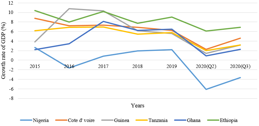 Events in one country or region of the world can have a significant impact on the chances for growth in another. Nigeria depends heavily on oil exports; therefore a ban on oil exports to the United States, for example, may have a negative impact on Nigeria's economic development. This information is used to compare the economic growth rates of a few selected SSA (Sub-Saharan Africa) countries in Figure 1. Nigeria's GDP growth rate fluctuates across the five-year period from 2015 to 2020, despite the country's abundant natural and human resources. These successions of changes from one time to the next have been attributed to insufficient policy (CBN, 2020).