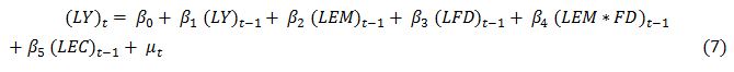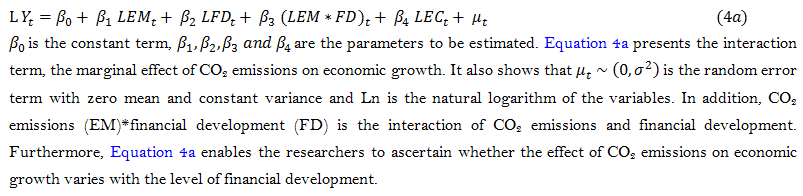Equation 3 illustrates the dependence of economic growth on CO2 emissions, financial development, the interaction of CO2 emissions, and financial development and energy consumption.