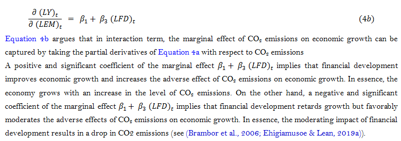 Moreover, from Table 6, the mean (i.e.14.9), minimum (i.e.8.71), and maximum (i.e.38.4) levels of financial development are substituted in in Equation 9 in order to obtain the marginal effect of CO2 emissions on economic growth at different levels of financial development. The results obtained after computations show the marginal effect values for mean (i.e. 0.21), minimum (i.e. 0.09), and maximum (i.e. 0.64) levels, respectively. The findings are consistent with the literature (see Ehigiamusoe (2020) ).