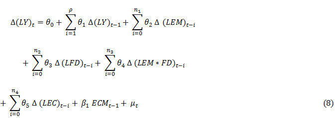 Furthermore, following the confirmation of a long-run linear relationship (cointegration) among the variables, the short-run coefficients are estimated using the short run / Error Correction Model specified in Equation 8 as follows: