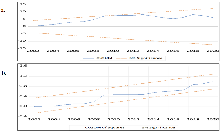 Some of the diagnostic tests conducted include Breusch- Godfrey (BG) serial correlation test, Jarque-Bera (JB) normality test, Breusch-Pagan-Godfrey (BPG) heteroskedasticity test, and Ramsey Regression Equation Specification Error Test (RESET). Stability tests were carried out in this study which includes the cumulative sum (CUSUM) of recursive residual and also the cumulative sum of squares (CUSUMSQ) of recursive residuals tests, respectively.