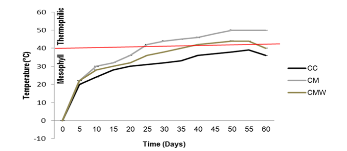Fig-1. Temperature monitoring during 60 days for the evaluation of the decomposition processes of the different mixtures analyzed. Means (±standard error) within each column of dietary treatments with no common superscript differ significantly at P <0.05. C: Compost Control; CM: Compost + Molasses; CMW: Compost + Milk Whey.