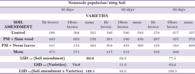 Table 1 shows the synergistic effect of different organic soil amendments on root-gall nematode population at different interval. Cowpea varieties on plots treated with soil amendments recorded lower nematode population at 30, 60 and 90 days over the corresponding untreated plots (control). The plots where mixtures of poultry manure and neem leaves were applied recorded the lowest nematode population (464, 369 and 289) larvae/ 200g soil at 30, 60 and 90 days respectively when compared with the corresponding untreated plots (control) (565, 583 and 596). The reduced nematode population recorded on plots amended with combination of poultry manure and neem leaves might be attributed to their chemical compositions which might be toxic to the root-knot nematode. Ismail, et al. [14