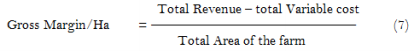 Gross margin analysis: The gross margin, the return over variables cost is an appropriate measure of profitability used for comparing enterprises for short run annual planning decision [6]. It forms the basis of most analysis and planning procedure and enables a practicing farmer to understand his business better: