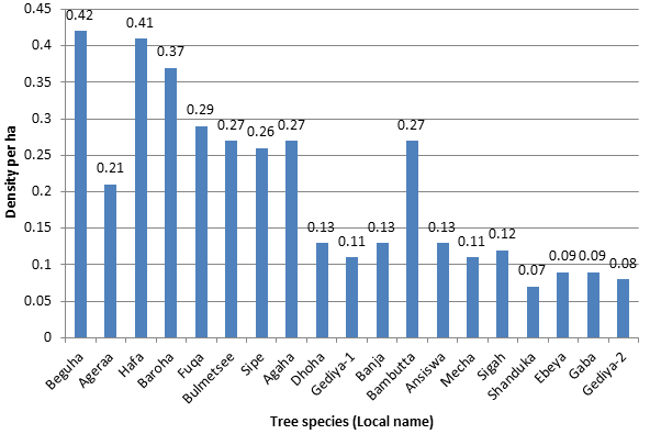As shown in Table 1 On average, 3.82 trees per hectare (ha-1) were recorded in the greener belt of Ethiopia. The number of trees ha-1 ranges from 2 to14 (standard deviation (STD) = 3.26). About 30%, 21% and 49% of trees were found on the farm plots surveyed in Senne, Fuafate and BHgL villages respectively. The respective minimum and maximum numbers of trees ha-1 were 2 and 9 in Senne, 6 and 10 in Fuafate, and 5 and 14 in BHgL, village. The average number of trees ha-1 was 2.92 (STD = 2.42) in Senne, 3.94 (STD = 2.89) in Fuafate, and 4.67 (STD = 3.75) in BHgL, village.