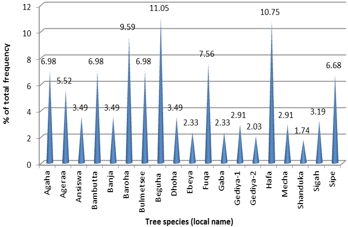 As presented in Table 2 and Figure 2 and 3, overall 19 species of trees that belong to 7 families were identified on the surveyed farms. This is significant number as compared to 88 tree species that are identified in vegetation of BGR in its natural setting [24], a region located in the greener belt of Ethiopia. On average 3.82 trees per hectare (min = 2 & max = 14) were retained on the surveyed farm plots. Similarly, according to Table 1 2.68 tree species per hectare (min = 2 & max = 9) were identified on the farms.