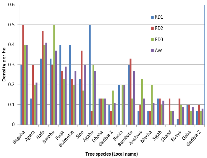 ]. Basal area method is most appropriate in natural forest ecosystems and P/A is most likely a purely qualitative technique. The SAR model and stem density ha-1 have certain resemblance and are appropriate for the current study. Thus, in this paper a sort of SAR model was used to measure and describe the characteristics of tree abundance. Each indicator of abundance is expressed in terms of number ha-1. The calculations were performed using Excel. The overall density of trees as well as species density was determined as the ratio of the total number of trees or species ha-1. Tree composition was determined differently for tree species and their families as total number of each, tree species or, family per 100 total species or families. The results were therefore compared between the three RDs and the two ethno-culture groups in order to understand whether differences in the pattern of these characteristics of tree abundance existed or not. To do this, the findings were presented in tables and figures, described, discussed and interpreted thoroughly.