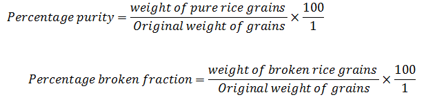 The percentage purity and broken fraction of rice cultivars was determined using 100 g total weight of the rice. The broken rice was separated from the ‘head rice’ and pure rice was separated from the contaminants. The percentage purity and broken fraction was calculated as described by Livingstone [10].