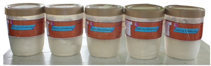 Source: Plastic containers from left to right are NERICA L-34, NERICA L-19, LOCAL rice, FARO 52 and FARO 44 (i.e. Rice and soybeans 70:30 with malt).