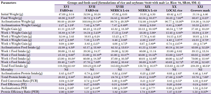 Six sets of male weanling rats from the same colony (21 days old) were used and each rat was housed in individual plastic cages at average temperature of 28 ± 2oC, humidity 29 ± 1%. The initial average weight of rats is 49.34 ± 5.92 g. Each set contain 10 rats per assay group. Rats were acclimatized for seven days. Five formulated diets and one commercial rat food (control) were used for this study. The formulations used for PER study are those with rice and soybeans 70:30 with malt. Casein control diet was not used instead growers mash (control) containing 15.50 g protein which are available and have proven suitable as rat food for experimental studies was used. Each diet was measured (i.e. 20 g) into several portions to facilitate feeding and recording of results. Each rat was provided with 20 g feed each time, but feeds were either replenished or weighed out (residual feeds) when there is need. Subsequently, one set of rats were allowed to continue feeding on the reference commercial rat food (control) while the five sets were fed on the test diets (containing test protein). Summations were done every week. Rats feeding pattern were ad libitum (both feeds and water).