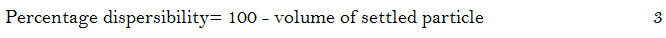 Dispersibility was determined using the method described by Kulkarni, et al. [30]. Ten grams of the flour sample was weighed into 100 ml measuring cylinder, water was added to each volume of 100 ml, the set up stirred vigorously and allowed to stand for three hours. The volume of settled particles was recorded and subtracted from 100 using Equation 3 .