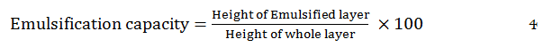 The procedure of Adeleke and Odedeji [33] was used. 1 g of the flour sample was suspended in 50 ml centrifuge tubes and centrifuge at 4100 rpm for 5 minutes. The emulsification capacity was calculated using Equation 4 :
