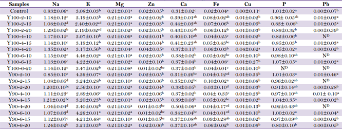 ] reported 0.11 and 0.015% phosphorus in Dioscorea rotundata grown in India. IPYFY has 1.05 (mg /100 g) and 0.01 (mg /100 g) of phosphorus and lead while control has 1.01 (mg /100 g) and 0.00 (mg /100 g.