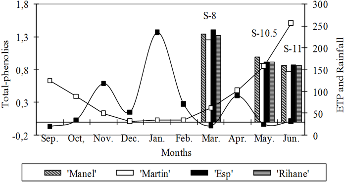 Like ‘Manel’, ‘Martin’ and ‘Espérance’, ‘Rihane’ registered the highest TP content at S-8 (1.32 mg TA/g). TP in ‘Rihane’ decreased as WD became pronounced. This decrease was 31 % between S-8 and S-10.5 (1.32 mg TA/g vs 0.91 mg TA/g) and 9 % between S-10.5 and S-11 (0.91 mg TA/g vs 0.83 mg TA/g). The global decrease registered by the variety ‘Rihane’ from S-8 to S-11 was about 37 % Figure 3.