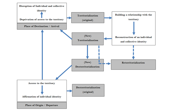 “The fact that individuals, faced in the light of human and social capital, move from their place of origin to a certain destination, causes them to break with their individual / collective identity, for they move from a space they "dominate" to another that is alien, whose symbolic and identity capital they do not fully understand. The deprivation of access to the original territory leads to a deconstruction of one's identity, both as unitary beings and as part of a community (of origin). This means that they get "deterritorialized””- (Velez De Castro, 2015 ).