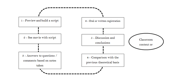 Nevertheless, we do not advocate the simple passage of films as a pedagogical and didactic instrument. In the process, we have to respect the cinematographic work, the students and the contents we need to introduce. There must be a moment before and after the film for the preparation and presentation of a theoretical basis and framework. The elaboration of a script that guides the students in the visualization, discussion, registers and comparison of the filmic reality with the theoretical aspects is a crucial instrument, as well as the selection of the movies. The previous work of the teacher is the basis for the success of this didactic approach.